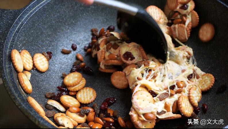 4、奶粉和棉花糖炒融合后把火关了,再倒入拌好的饼干,这里一定要趁热快速拌匀,凉了就不粘了。
