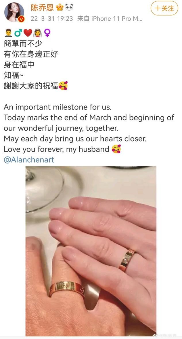 3月31日,陈乔恩在某社交平台上官宣与艾伦结婚,还配文道:“简单而不少,有你在身边正好,身在福中,知福,谢谢大家的祝福”,两人终于修成正果,引来了不少网友和粉丝朋友的点赞和关注。