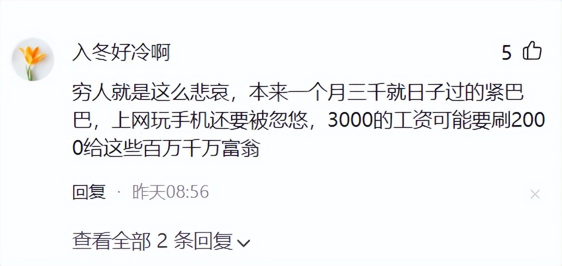 有人称:穷人就是这么悲哀,本来一个月三千就日子过的紧巴巴,上网玩手机还要被忽悠,3000的工资可能要刷2000给这些百万千万富翁