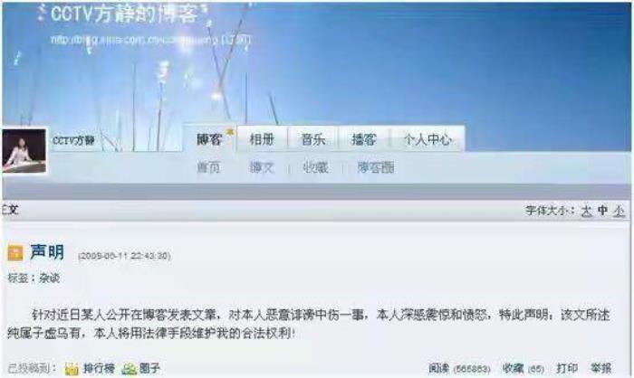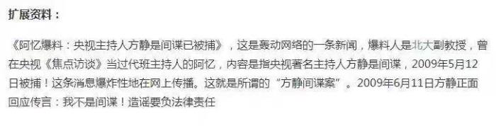 2009年,一篇题为《央视主持人方静是间谍已被捕》的博客在网上流传。