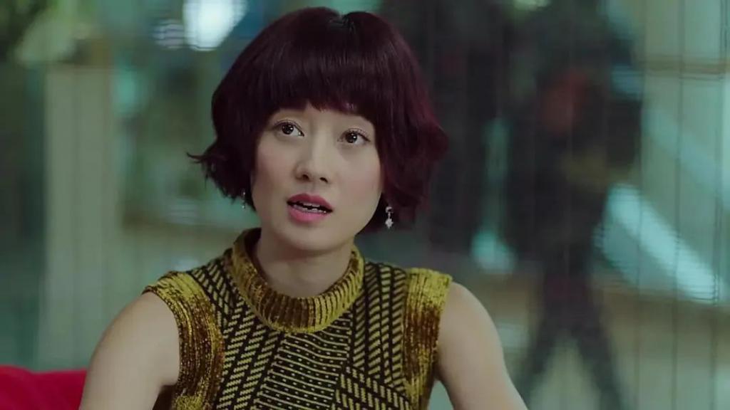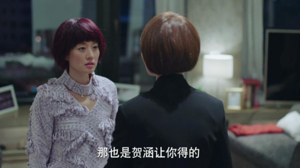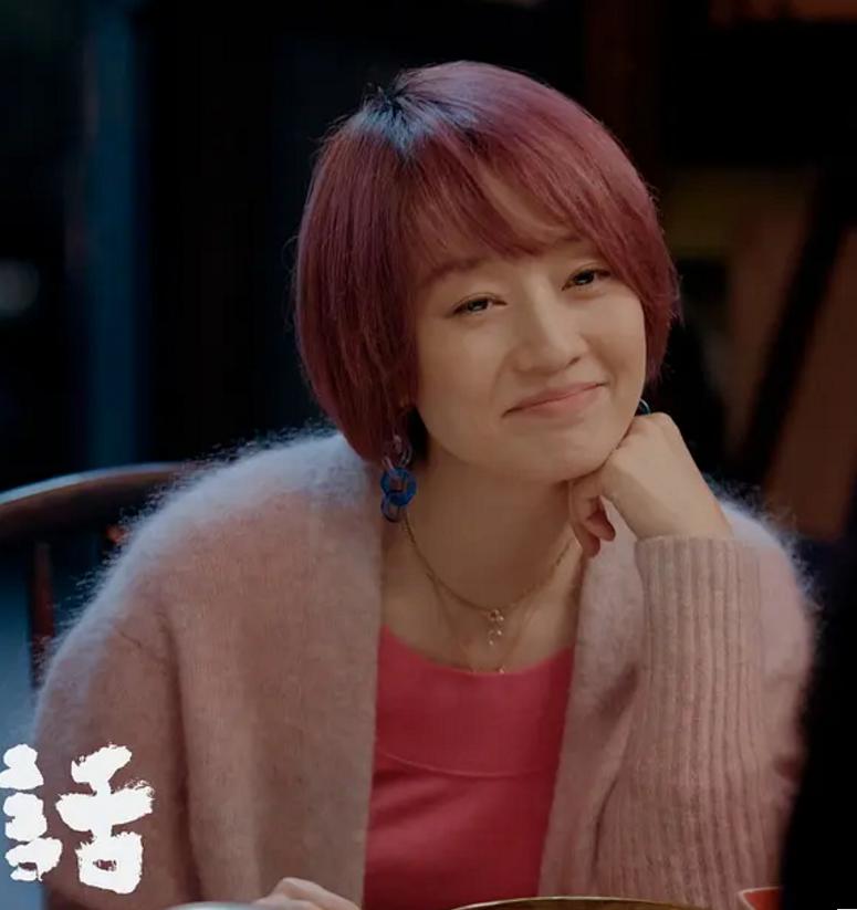 近年来她最好看的样子在《爱情神话》,头发长短和《锁春记》相近,过耳短发,染成有一点骚动的紫色,但又绝不是罗子君的咸菜紫,衣服是与头发相关的淡紫色开衫,内搭虽然还是玫红,但只要淡上那么一点点,效果就翻天履地。