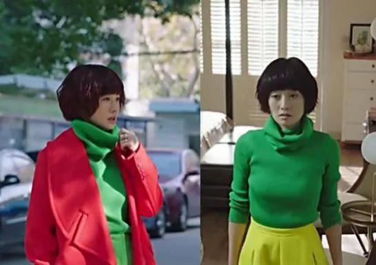 翠绿高领毛衣与大红色大衣,红配绿赛狗屁。她在剧中有很多高领毛衣,大多是非常考验功力的颜色,玫红色、姜黄色、桔色,连高跟鞋都是一色的翠绿和玫红,显见是对造型用了心。再搭配她酒红色不服管理的假发,也不晓得她从哪里找到这么多不贴头皮的假发。
