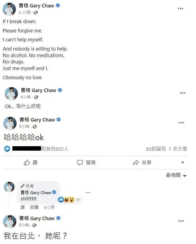 直到 27 日凌晨曹格仍连续发文,陆续写下 " 我在台北。她呢?"," 我的狗爱这个女人!!!这样会有新闻吗?" 随后再写一篇 "Ok… 写什么好呢 ","If I break down.Please forgive me.I can ’ t help myself.And nobody is willing to help.""Just me myself and I.Obviously no love."(" 如果我崩溃了。请原谅我。我无能为力。而且没有人愿意提供帮助。"" 只有我,我自己和我。明明没有爱。")