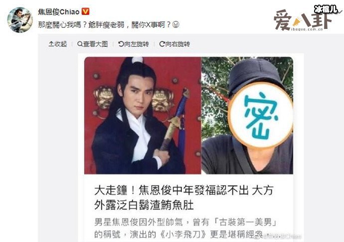 于是,就有了台媒的那篇文章,焦恩俊就在微博上发文回怼,称:“那那么心我吗?爷胖瘦老弱,关你X事啊?”然后还在下方评论,如果我跟当年一样,可能又会说我去整容或者妖怪吧?真是爷已不在江湖,江湖就没有新鲜事了吗?对此,很多网友都表示赞同和力挺焦恩俊,怼得好,关他们P事。