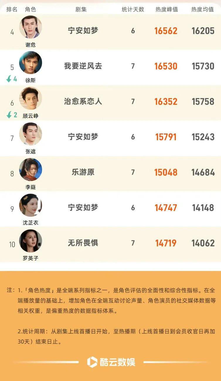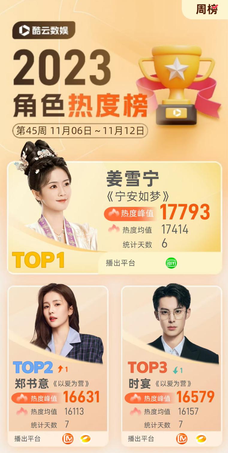 以这次《100 万个约定之宁安如梦》为例,根据酷云数娱的 2023 角色热度榜周榜中显示,在上周,电视剧《宁安如梦》中白鹿所饰演的姜雪宁获得了六次角色热度日冠,并且拿下了周榜的冠军。另外,在电视剧《宁安如梦》中,谢危、张遮、沈芷衣三个角色也分别上榜,一部剧独占四席。