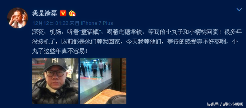 我们可以到涂磊老师的微博,我们继续往前翻看一下。双12的时候涂磊老师发文:“深夜,机场,听着“童话镇”,喝着焦糖拿铁,等我的小丸子和小樱桃回家!很多年没接机了,以前都是她们等我回家,今天我等他们,等待的感受真不好熬啊,小丸子这些年真不容易!”