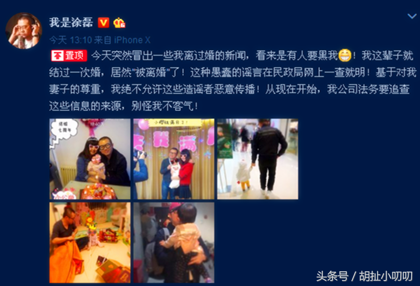 涂磊发文:“今天突然冒出一些我离过婚的新闻,看来是有人要黑我!我这辈子就结过一次婚,居然”被离婚”了!这种愚蠢的谣言在民政局网上一查就明!基于对我妻子的尊重,我绝不允许这些造谣者恶意传播!从现在开始,我公司法务要追查这些信息的来源,别怪我不客气!”看来,涂磊老师是很尊重妻子的,所以发微博给那些传言的人。