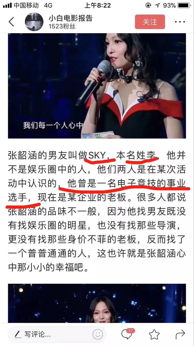 这到底是怎么回事呢?原来,张韶涵的男友叫SKY,而电竞人皇李晓峰也叫SKY,故事就这么巧妙的结合在一起了!