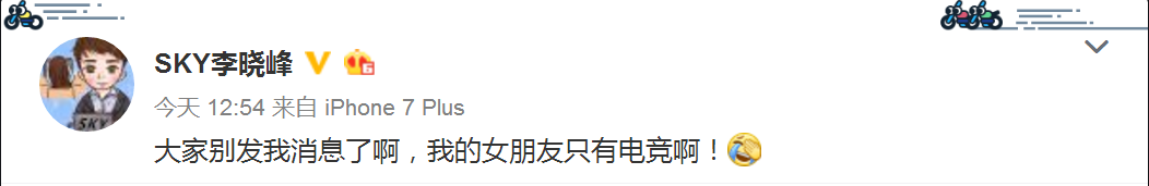 关于此事,今日SKY本人也在微博辟谣,声称自己女朋友只有电竞!