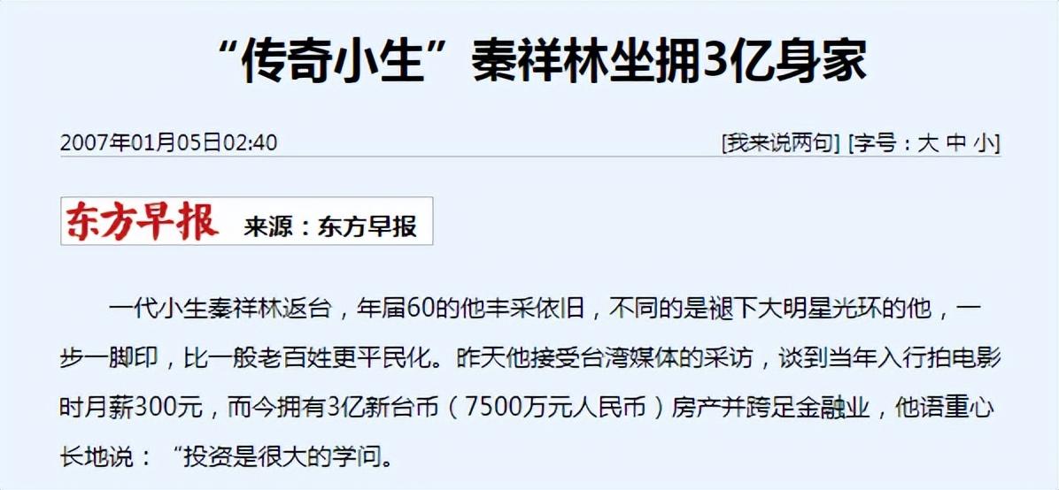 秦祥林成为演员经商的成功例子,身家更是一度达到3亿多。