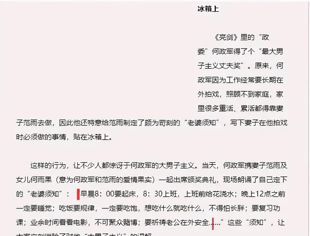 因为心疼妻子范雨,何政军每次外出拍戏,都会贴心地交代妻子很多事,制定了一个“老婆须知”,表达自己的爱意。