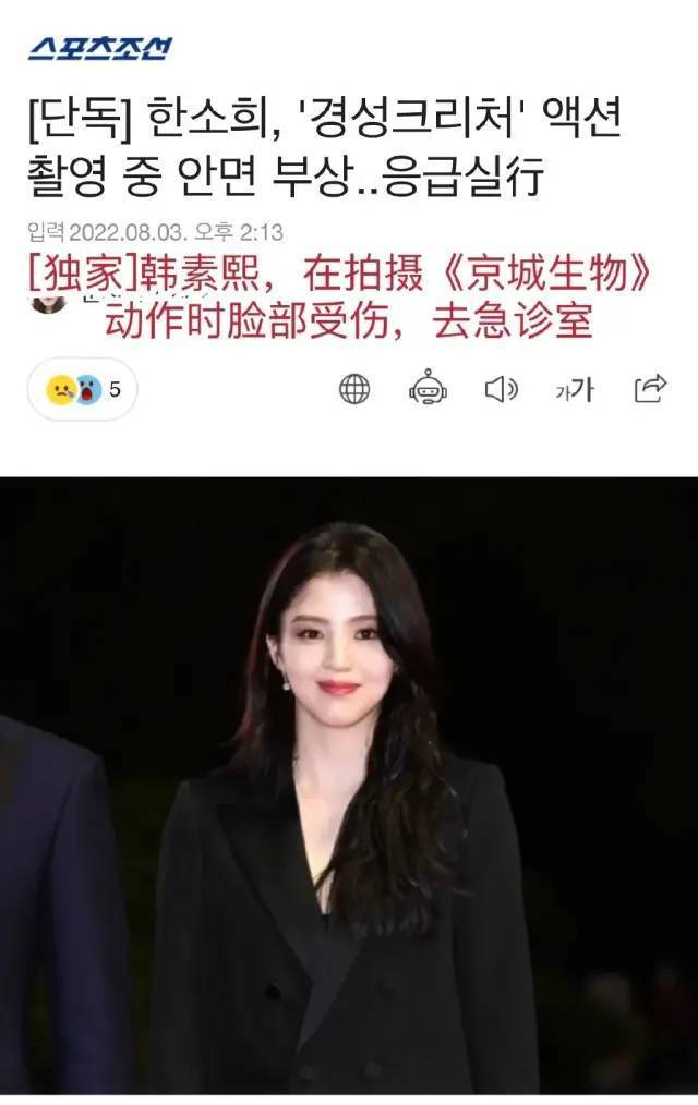 可是在她事业上升期时,屡屡传来了韩素希的坏消息,在拍摄新剧时,韩素希被爆出脸部受伤,需要送往医院抢救,这么精致的一张脸蛋,若毁容了,事业也就毁了一半了。她在拍摄高难度动作戏时不慎受伤,女主受伤,电视剧的拍摄也不得不紧急叫停,韩素希也被迫暂停营业