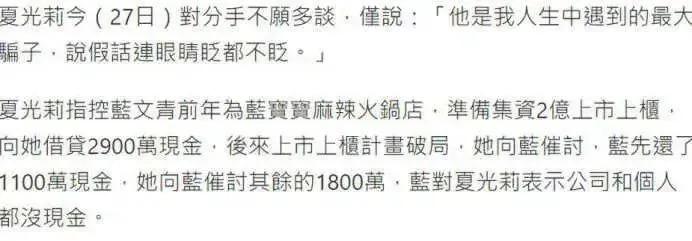 后来,回忆起这段感情,夏光莉说:" 他是我人生中遇到的最大骗子,说假话连眼睛眨都不眨。"