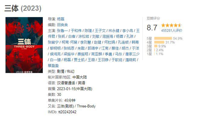 由张鲁一、于和伟、张瑾和王子文等人主演的国产版《三体》,现在在豆瓣的评分是 8.7 分。这个可是整个豆瓣网都不多见的高分剧,距离 9 分神作,仅有一线之遥。