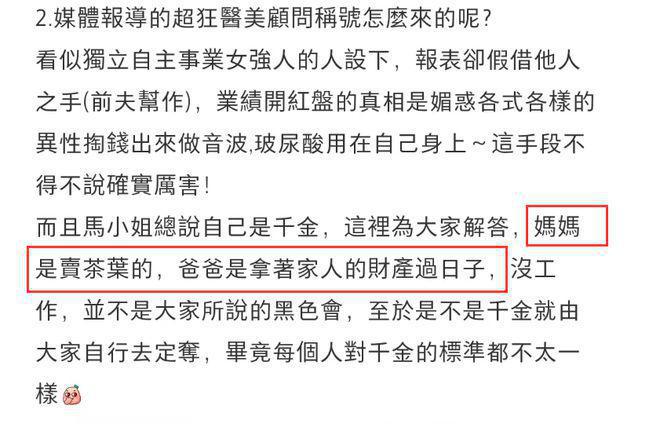 不止如此,马筱梅还被曝虚构 " 白富美 " 人设和家庭背景。父母都是普通人,而她本人则靠魅惑异性让对方掏腰包为自己做美容赚业绩。