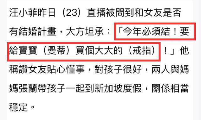 其实汪小菲此前就曾高调官宣再婚。上月 23 日,汪小菲直播被问到和女友是否有结婚计划时大方坦诚:今年必须结,要给宝宝(马筱梅)买个大大的戒指。他还在直播间猛夸马筱梅贴心懂事,对孩子很好。