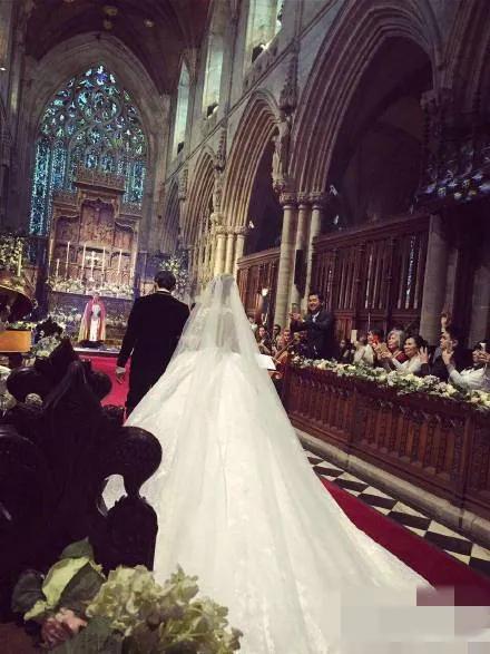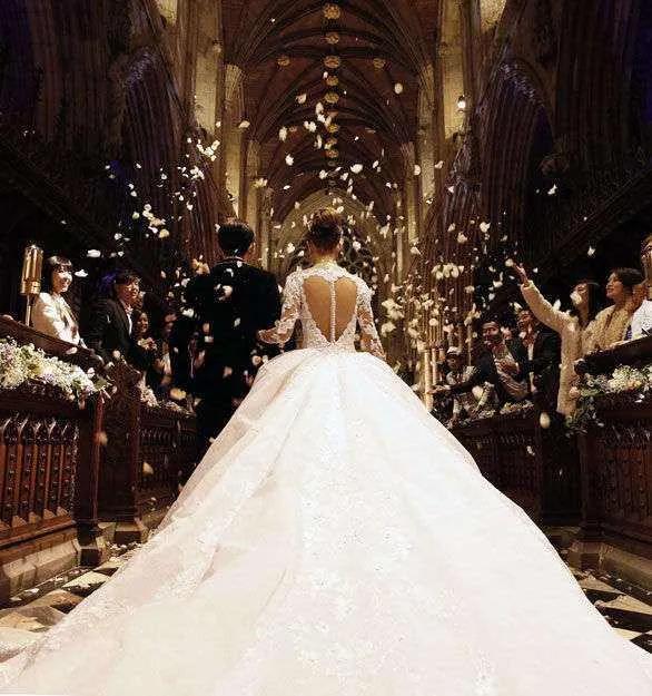 婚礼现场上,周杰伦如同王子一般,身穿黑色复古西装,搭配金丝刺绣,而昆凌头带着镶嵌1296克钻石的天价皇冠,身着超长拖尾婚纱,再结合顶级蕾丝以及心型露背设计,她成了每个女孩最羡慕的样子。