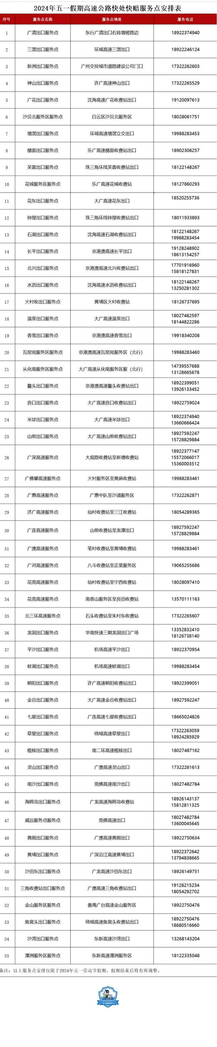 预计出行易拥堵缓行的高速主要是:沈海高速(沙贝互通 - 广清互通)、许广高速(广清互通 - 庆丰收费站)、莞佛高速(威远 A 收费站 - 南沙 B 收费站)、京港澳高速(鳌头收费站 - 北兴收费站)、广佛肇高速(平沙互通立交 - 永泰收费站)、广州机场高速(黄石收费站 - 蚌湖站路段)、乐广高速(花山隧道段)、华南快速(石门堂隧道 - 春岗立交)、北三环(机场北立交 - 杨荷立交)、广连高速、瓦窑岗服务区、沙贝服务区。