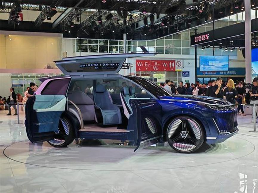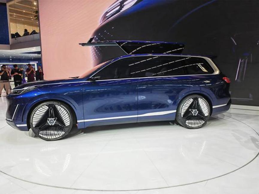 来到车侧,让人印象深刻的就是其采用了类似高合 Hiphi X 和 Z 车上的鸥翼门搭配马车门的车门设计,如此车门设计直接让新车成为了北京车展上最吸睛的 SUV 车型之一。不过量产之后如此炫酷的车门设计不知道是否能够保存下来。车尾部分,新车配备 U 型贯穿式尾灯,整体显示效果十分细腻,配备隆起的顶部刹车灯和宽大的后扰流板,让一台全尺寸 SUV 也具备一定的运动气息。