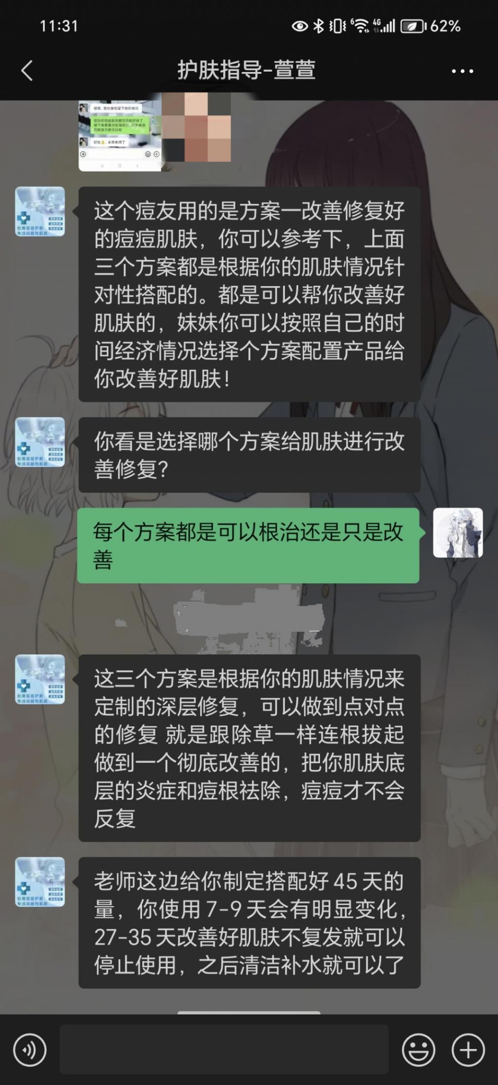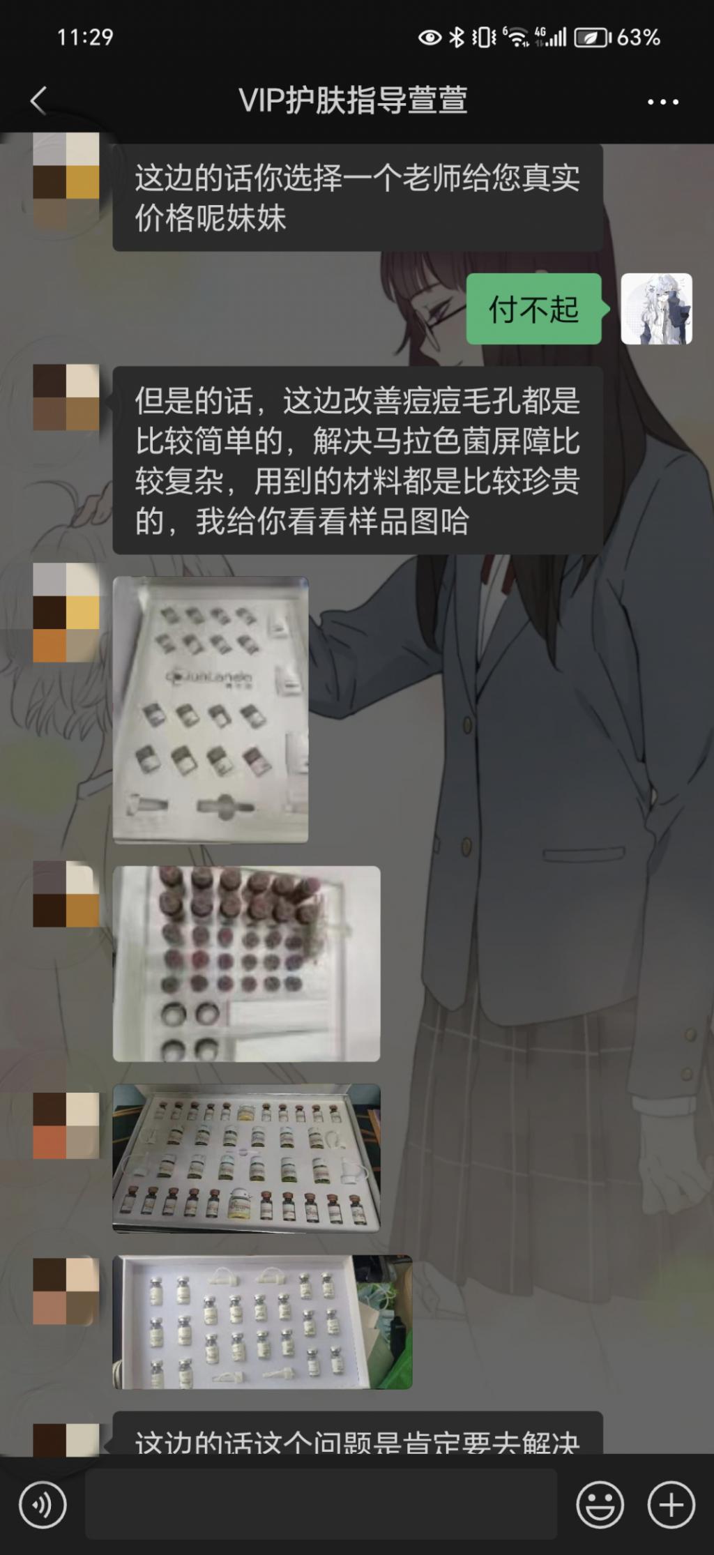 刚开始,加了 " 护肤指导 " 的微信后,小曾出于谨慎,并没有购买任何产品,只是做了一些简单咨询。然而,这位 " 护肤指导 " 却每天都给小曾发成功案例,还说可以根据小曾的面部情况,为她私人定制专属祛痘方案。
