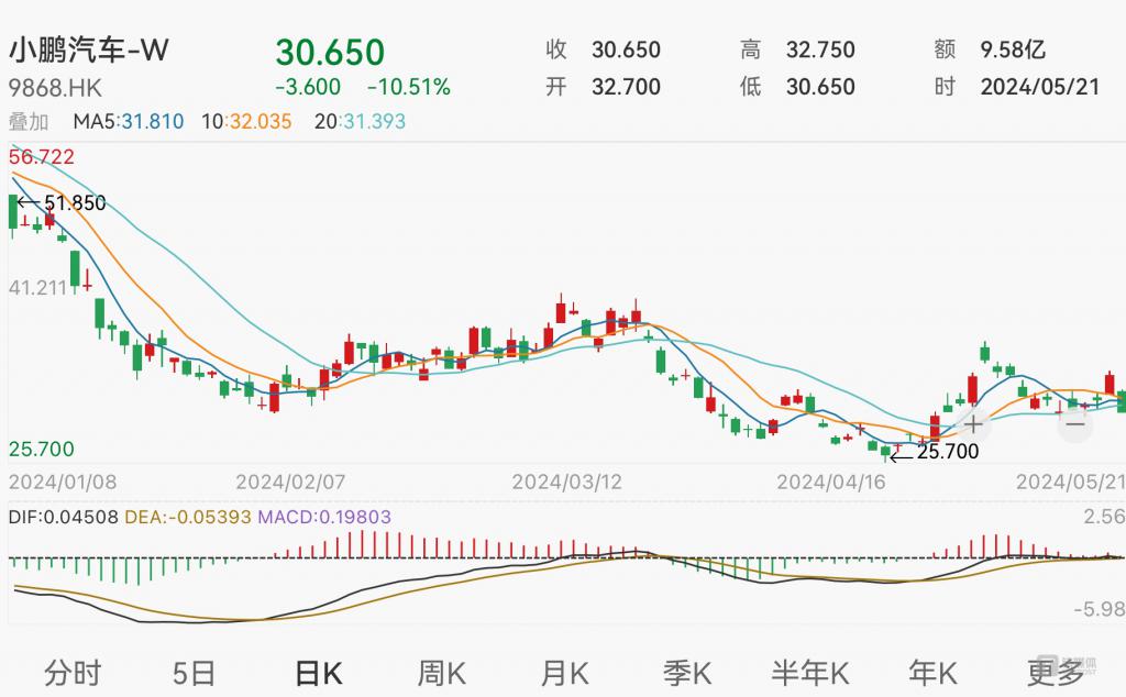 二级市场方面,截至 5 月 21 日港股收盘,小鹏汽车 -W 股价报收 30.65 港元,跌 10.51%,当前市值约 579.15 亿港元。