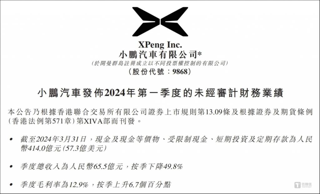 5 月 21 日晚,小鹏汽车 -W(09868.HK)发布了 2024 年第一季度业绩报告。期内,公司实现度总收入约 65.5 亿元,同比增长 62.3%,环比下降 49.8%;净亏损为 13.7 亿元,去年同期为亏损 23.4 亿元,同比亏损大幅收窄 41.5%,但环比扩大 1.5%,调整后每股亏损 0.75 元。