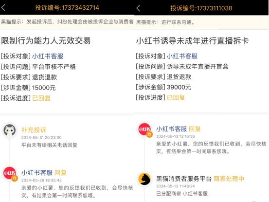 实际上,法治网记者注意到,类似情况在社交平台时有发生,在黑猫投诉中输入 " 未成年人拆卡 " 等关键词,均有大量案例,其中涉及金额有的甚至高达 39000 元,但是平台方在处理过程中大都只是回复一句 " 您的反馈我们已收到,会尽快核实,有结果会第一时间联系您 ",便再无后续,也有相关受害人因此补充投诉," 平台未有给相关电话回复 "。
