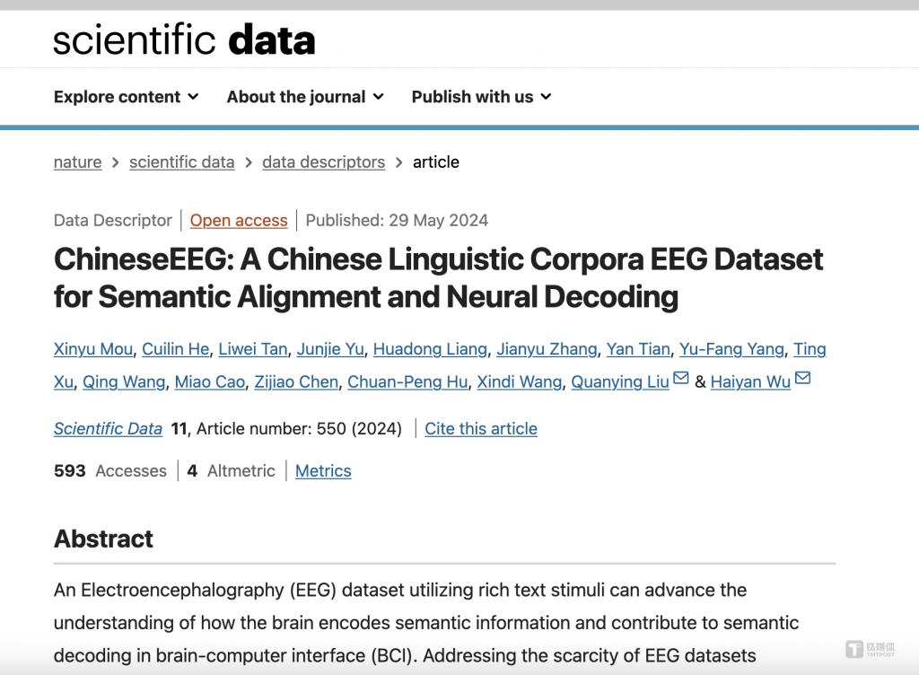 天桥脑科学研究院资助的首个中文脑电图数据集研究项目登上《自然》子刊