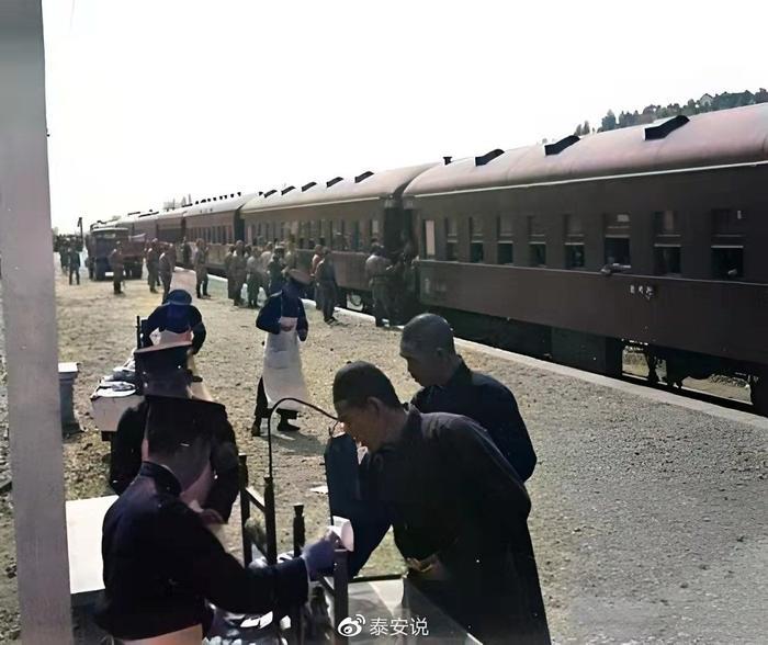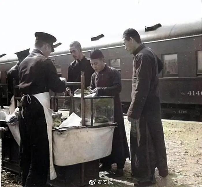 这是1940年,泰山火车站的商贩在车站内贩卖的场景,当时的他们穿着统一的制服,卖着各式各样的餐点。当时小日子过的不错的那些鬼子正盘踞在泰安,从后面背景中可以看到部分日本侵略者的身影。