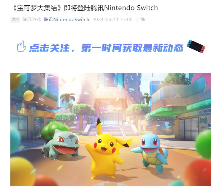 腾讯游戏今日宣布,《宝可梦大集结》即将登陆腾讯 Nintendo Switch,并将在不久的将来开启一场由部分国行 Switch 用户参加的 " 集结测试 ",拥有国行 Switch 的玩家均有机会获得参加资格。