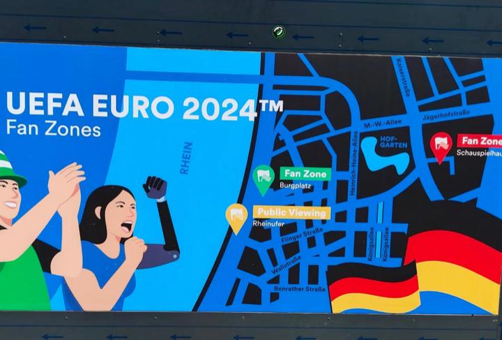 她仔细一看,原来是告知球迷的观赛指南海报,地图上标注着三个 " 球迷区 ",莱茵河边还竖起了一个巨幕 LED,供球迷在露天免费看球。