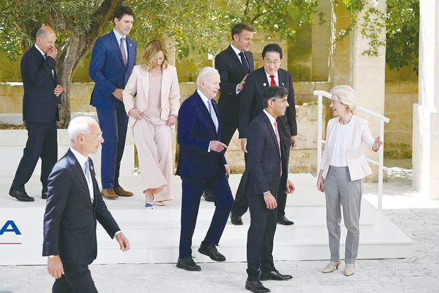 七国集团(G7)峰会 13 日在意大利南部普利亚大区开幕。图为 G7 国家领导人和欧盟领导人等合影后离开。(法新社)
