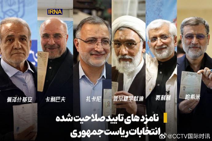 根据伊朗内政部公布的通过伊朗宪法监护委员会(宪监会)资格审查的总统候选人名单,这 6 人分别是伊朗议会议长卡利巴夫、副总统哈希米、德黑兰市长扎卡尼、前首席核谈判代表贾利利、前内政部长普尔 - 穆罕默迪、前卫生部长佩泽什基安。他们此前都曾参加过总统竞选。