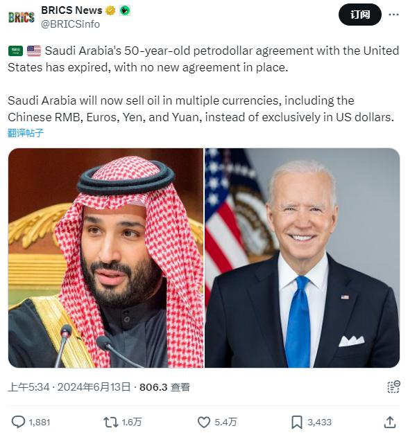 一则社交媒体上转发量较多的信息源,来自于 BRICS News。下面这张截图中的信息,其实也就是国内媒体密集报道内容的核心部分。甚至还有一名印度金融学教授在 X 上发文说:" 这是对美元霸权的重大打击!沙特拒绝与美国续签 50 年的石油美元协议。"