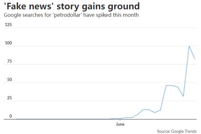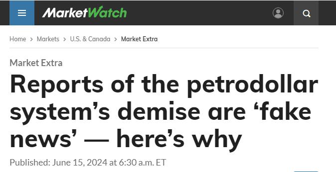 北京时间 6 月 15 日(周六)下午,《每日经济新闻》记者用谷歌搜索 " 石油美元 "(petrodollar)一词,第一个结果为道琼斯旗下财经媒体 MarktWatch 写的文章,对该新闻进行了定调,认定为假新闻。其标题为《关于石油美元体系消亡的报道是 " 假新闻 " ——原因如下》