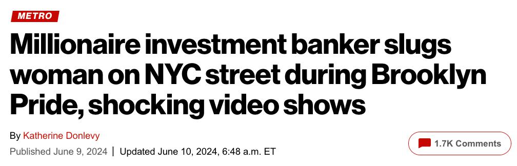 据纽约邮报 6 月 10 日报道 上周六晚上,一名百万富翁投资银行家涉嫌殴打一名女子的面部,导致她摔倒在布鲁克林的一条街上,视频记录了下打人的画面,并在社交媒体上疯传。