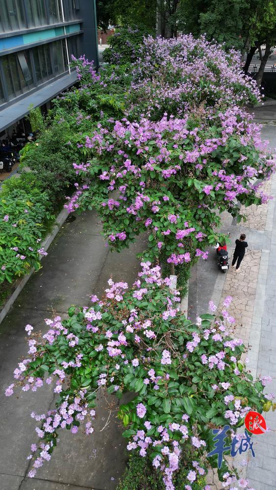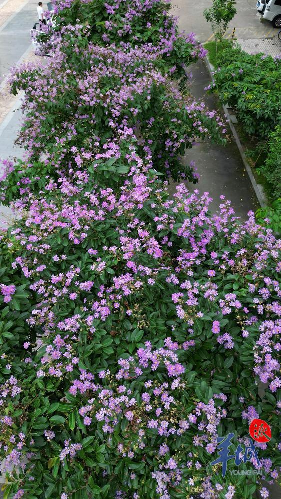 漫步街头、马路、公园、小区、河岸、湖边……处处可见枝繁叶茂的大叶紫薇树盛开着粉嫩的花朵,格外妖娆,如浪漫的 " 紫色花瀑 "。