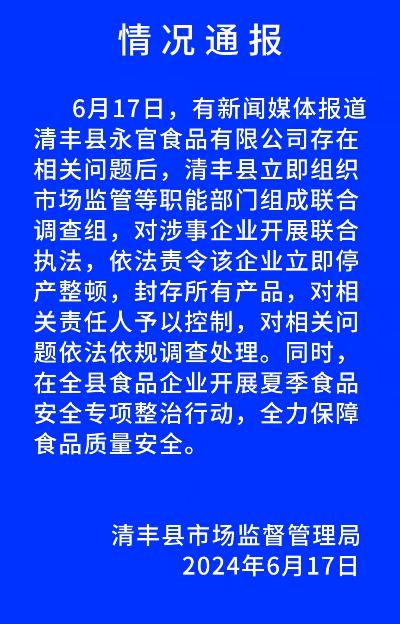 6 月 17 日,有新闻媒体报道清丰县永官食品有限公司存在相关问题后,清丰县立即组织市场监管等职能部门组成联合调查组,对涉事企业开展联合执法,依法责令该企业立即停产整顿,封存所有产品,对相关责任人予以控制,对相关问题依法依规调查处理。同时,在全县食品企业开展夏季食品安全专项整治行动,全力保障食品质量安全。