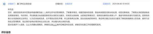 6 月 6 日,厦门市妇女联合会也对该知情人士的诉求作出了回复。回复中写道:" 市妇联通过仙岳医院联系到女孩的主治医生,在核实女孩病情、出院规定等情况后,指导区妇联到女孩家入户,直接与其母亲进行沟通交流。因其母亲表示女孩是被其父亲带走,认为应该由其负责,且不想因此发生矛盾,所以拒绝再谈此事。因女孩疾病的特殊性,我会再次通过女孩主治医生了解到其他联系人的信息,最终与女孩姑丈取得联系,姑丈表示会将此情况转达女孩父亲,并加强与其父亲的沟通。因涉及诸多个人信息,以上为简要处理情况。"