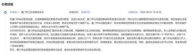 6 月 4 日,厦门市卫生健康委员会回复表示,经厦门市仙岳医院核查,为使病情稳定的患者尽快回归家庭、适应社会生活,厦门市仙岳医院曾联系患者家属办理出院,同时也可以缓解医院和病区床位紧张问题,但反复建议家属都不肯为患者办理出院手续。今年 5 月 29 日,厦门市仙岳医院医务部门联系诉求人向其说明,根据精神卫生法相关规定:精神障碍患者的住院治疗实行自愿原则;精神障碍患者出院,本人没有能力办理出院手续的,监护人应当为其办理出院手续。因此,医院无法直接为患者办理出院手续。