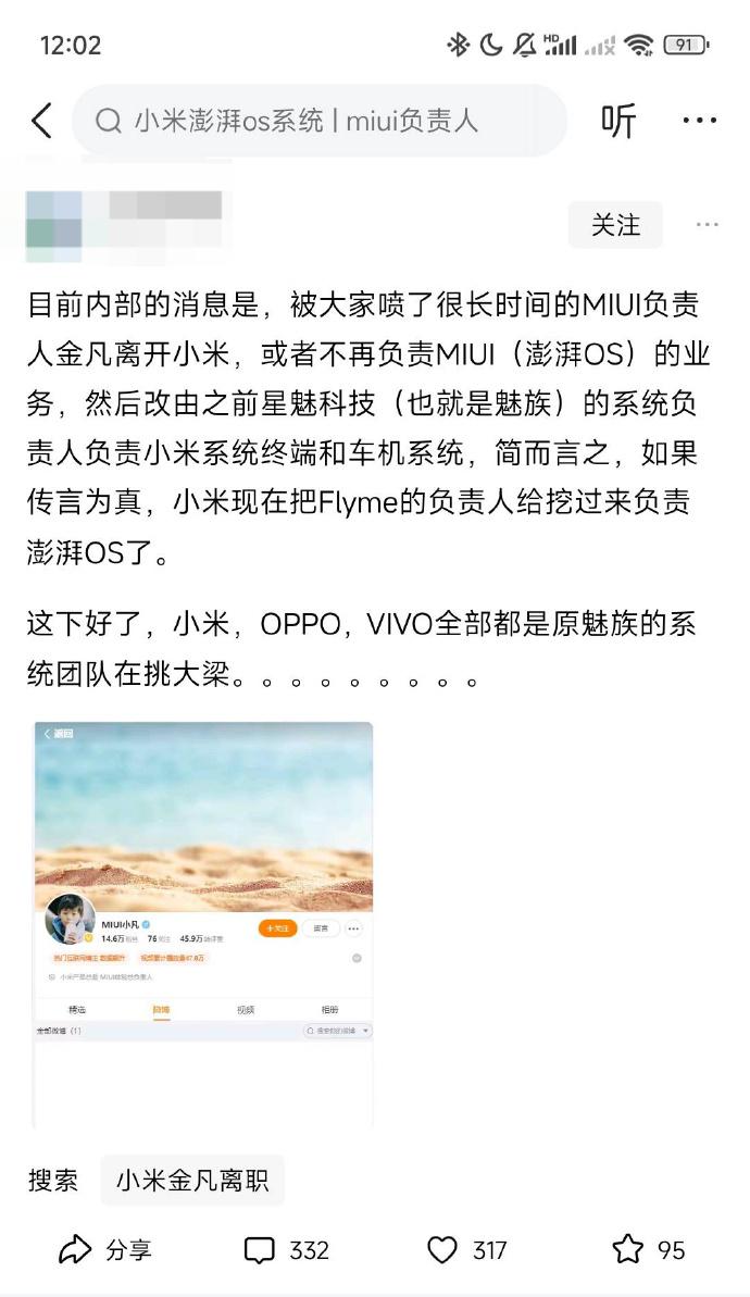 IT 之家 8 月 5 日消息,近期有消息称小米集团手机部副总裁、MIUI 体验总负责人金凡将离开小米,或者不再负责 MIUI(澎湃 OS)的业务,目前其微博个人主页显示为 " 暂无内容 "。