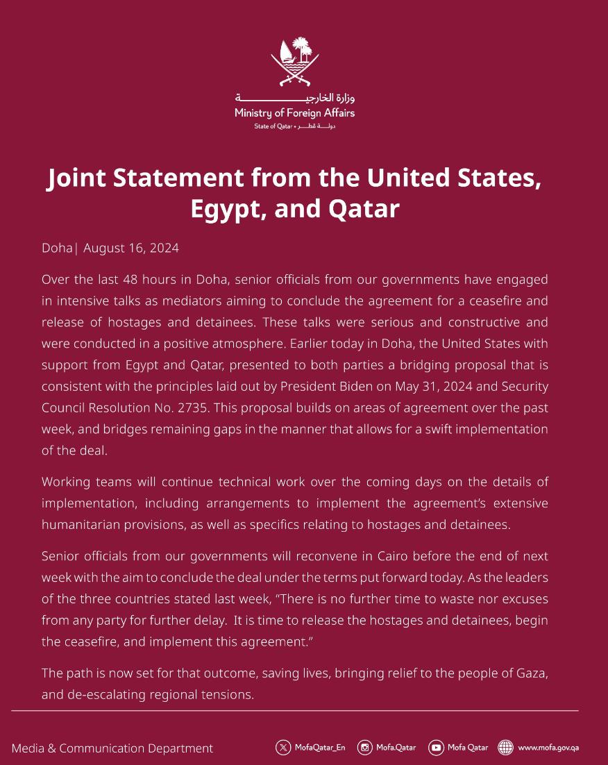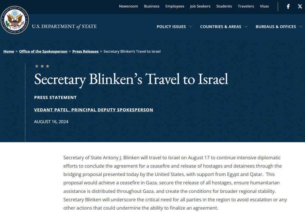 在声明中,美国国务院副发言人韦丹特 · 帕特尔表示,通过今天提出的过渡性提案,将在加沙实现停火、确保释放所有人质、确保人道主义援助在整个加沙地区分发,并为更广泛的地区稳定创造条件。布林肯也强调,该地区各方迫切需要避免局势升级,或任何其他可能破坏达成协议能力的行动。
