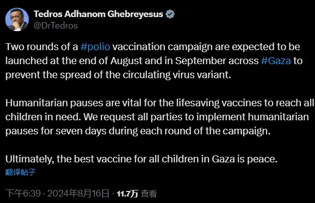 与此同时,哈马斯方面也在周五发声,支持联合国方面提出的 "7 天临时停火 " 呼吁。此前在 7 月 30 日,加沙地区卫生部门宣布该地区为 " 脊髓灰质炎流行地区 ",为此世卫组织表示需要展开两轮疫苗接种运动,来防止病毒迅速传播。
