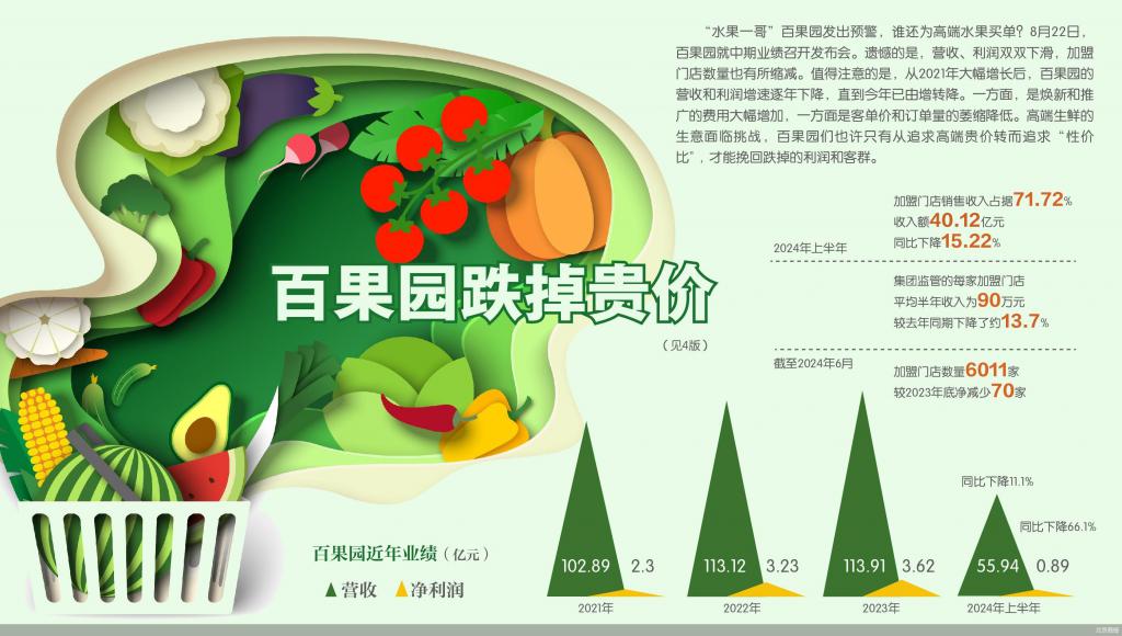 对此,百果园坦言门店数量下滑主要是市场消费能力减弱,导致门店销售额减少,而门店租金上涨,促使一些表现不佳的门店关闭。今年上半年,撑起百果园总收入的加盟门店同比缩减了 88 家,百果园加盟店的收入也从去年同期的 47.3 亿元降至 40 亿元。