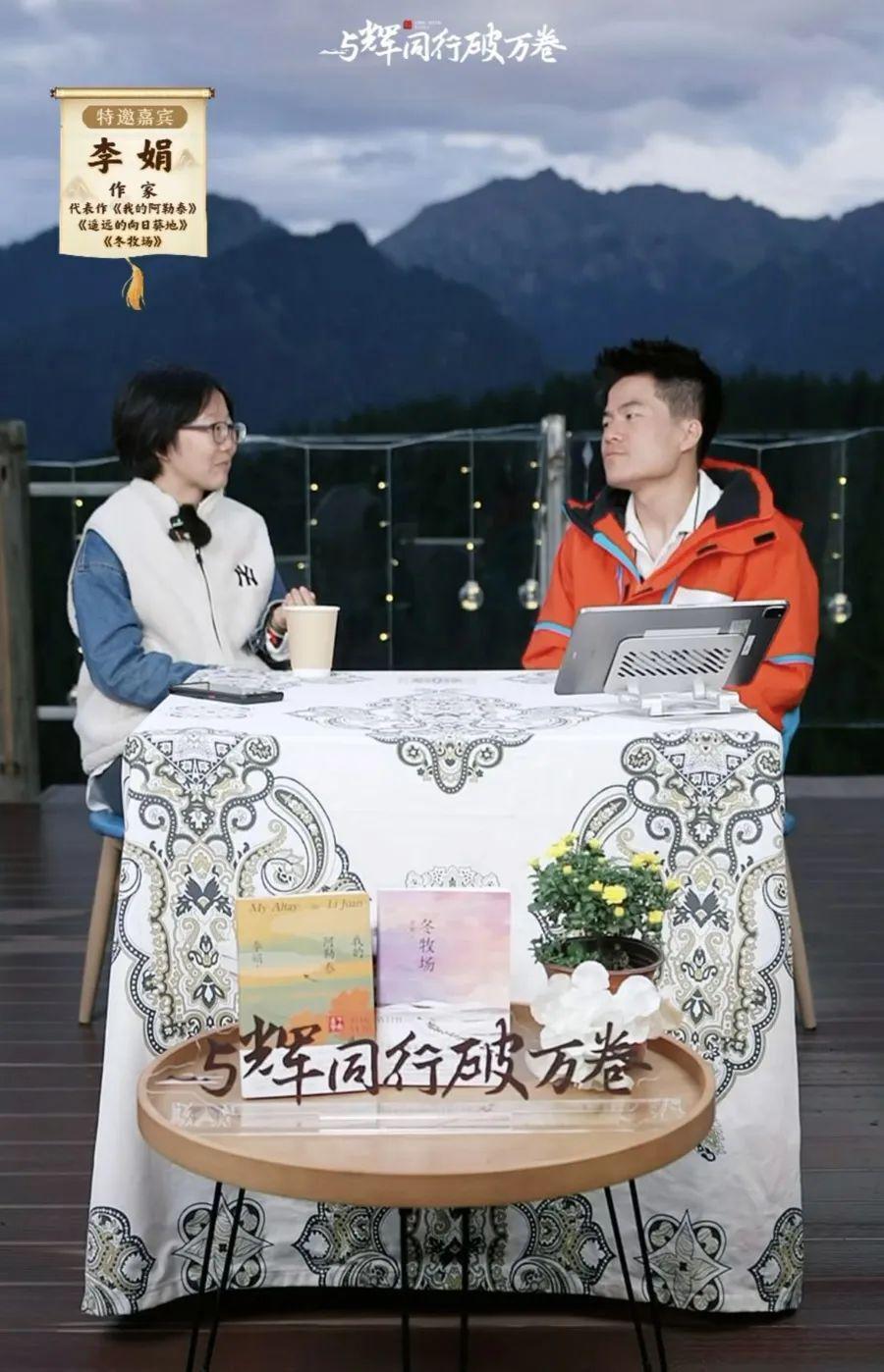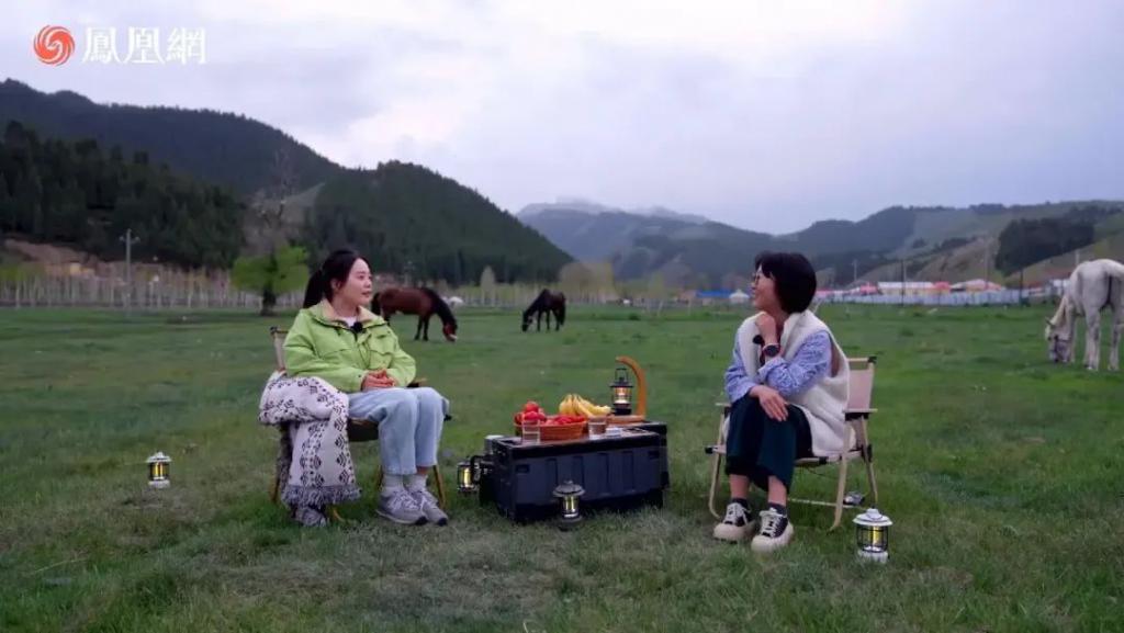 今年 5 月份,电视剧《我的阿勒泰》热播期间,凤凰网做了一次对谈。女主持人魏冰心和李娟坐在户外草地上,背后是自在吃草的牛羊。访谈从白天讲到夜幕降临,两位女士怕冷,在膝盖上搭上了毯子。