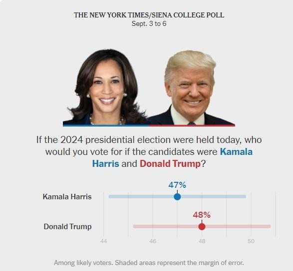 《纽约 · 时报》和锡耶纳学院 8 日公布的最新民调也显示,特朗普的支持率(48%)仅领先哈里斯(47%)一个百分点,在误差范围内,双方势均力敌。