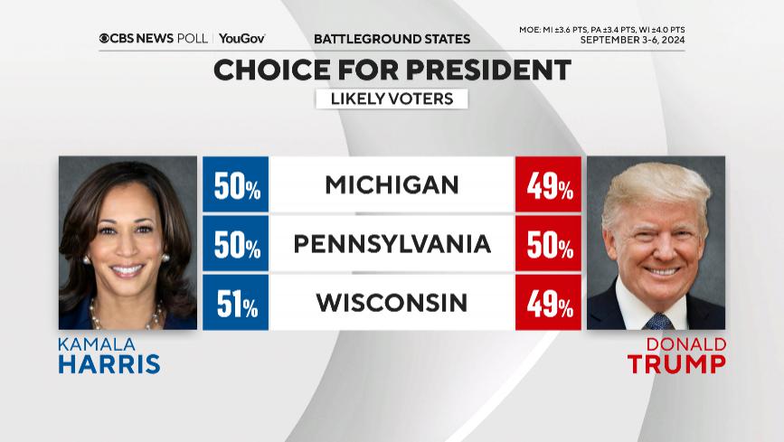 本月初,哥伦比亚广播公司(CBS)与民调公司联合进行的最新民调结果显示,在密歇根州、宾夕法尼亚州和威斯康星州这 3 个关键州,哈里斯和特朗普的支持率分别为 50% 对 49%、50% 对 50%、51% 对 49%。