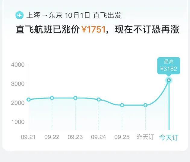 但从国际航班来看,热度却居高不下。国庆出境游机票订单量最高的城市全部在 5 小时飞行圈内,前十城市分别是中国香港、泰国曼谷、马来西亚吉隆坡、韩国首尔、日本大阪、日本东京、新加坡、印度尼西亚巴厘岛、泰国普吉和中国澳门。如 10 月 1 日上海直飞东京最低直飞裸票价为 3182 元,耗时 2 小时 50 分钟,价格走势显示已经涨价 1751 元。