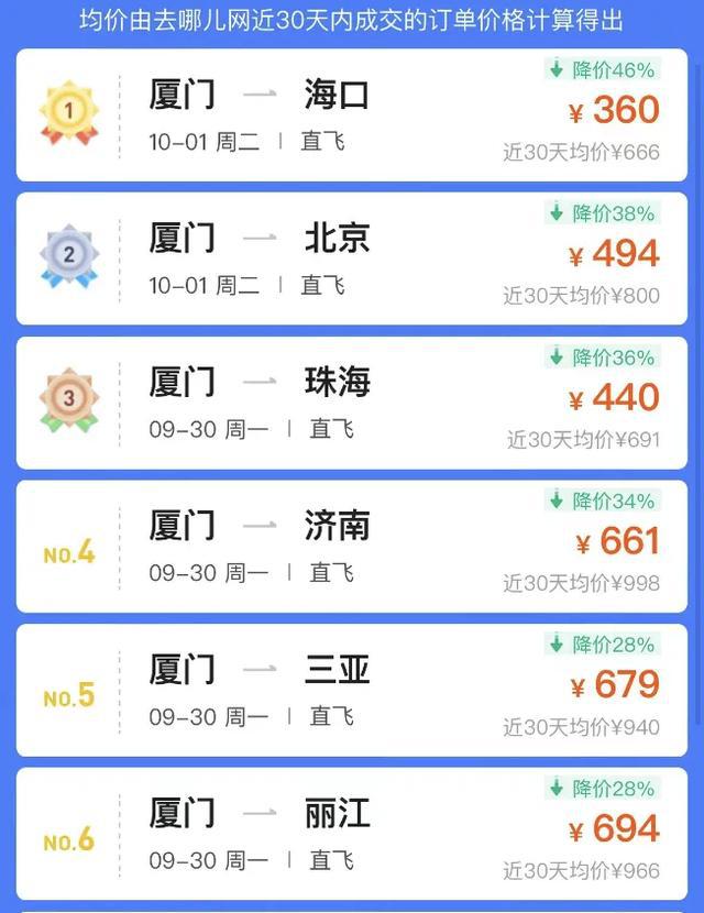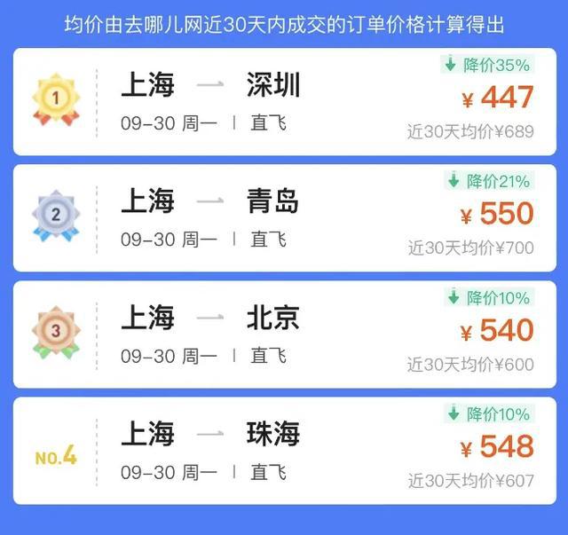 不仅如此,记者查询发现,不少热门城市国庆假期去程机票都有不同程度的跳水,9 月 30 日从上海出发到深圳、青岛等城市均有不同程度的价格跳水。