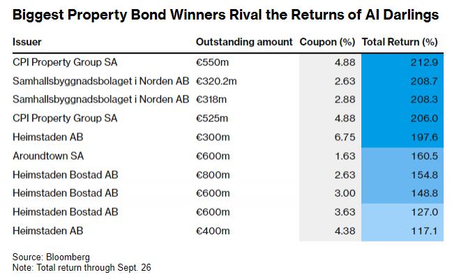 混合债券是房地产公司债券中风险最高的一种,今年的回报率整体超过了 75%。在被称为次级债券 ( subordinated bonds ) 的一系列品种中,表现最好的 10 只债券在此期间的回报率高达约 170%,甚至比 AI 热潮中当仁不让的 " 宠儿 " ——英伟达的年内回报率,还高出了 20 个百分点。